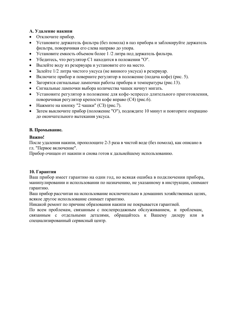 Отключите прибор, переводярегулятор работы в положение”0″ (рис.2 С1) Удалите накипь всоответствии с указаниямиинструкции (см. гл. IX)