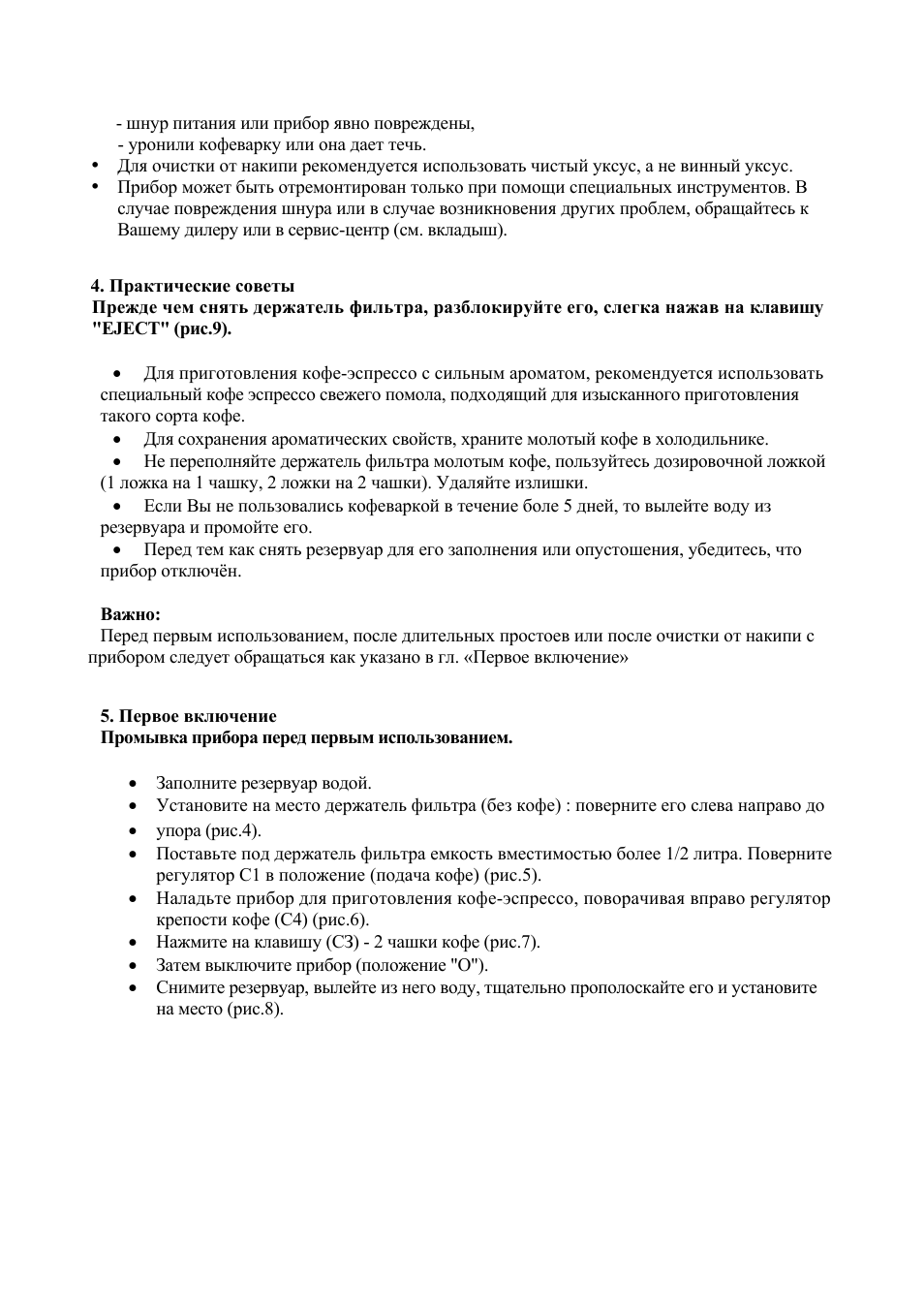 рукоятке держателя фильтра (рис.3). Промойте держатель фильтра под проточной водой, нажимая на клавишу «EJECT» для удаления остатков гущи (см. гл.YIII.В/ для более глубокой чистки).