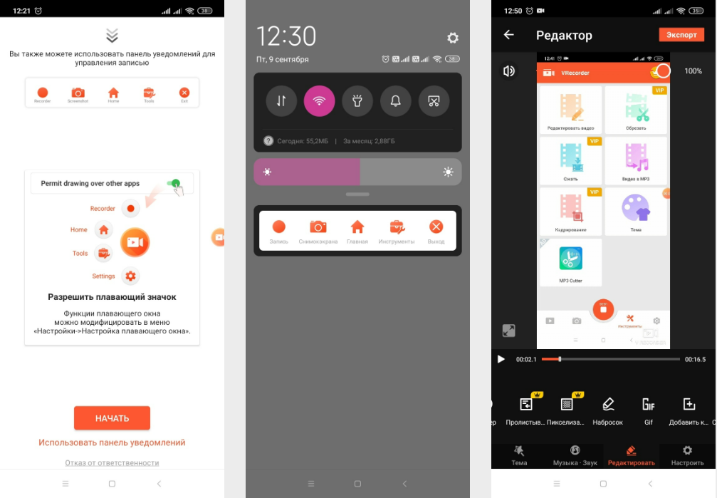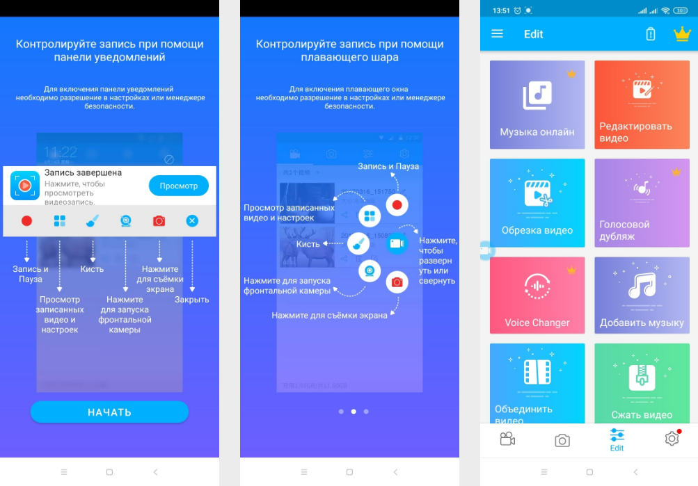 Популярное приложение, которое находится в свободном доступе на Google Play. Функционал схож с системной программой. Указываем желаемые параметры записи (разрешение, качество, FPS, ориентацию), и кликаем по виджету. После обратного отсчета видео начинает записываться. Чтобы его остановить, нажимаем по кнопке «Пауза». Встроенный редактор предлагает обрезку, выбор скорости, наложение музыки и текста, а также указание пропорций.