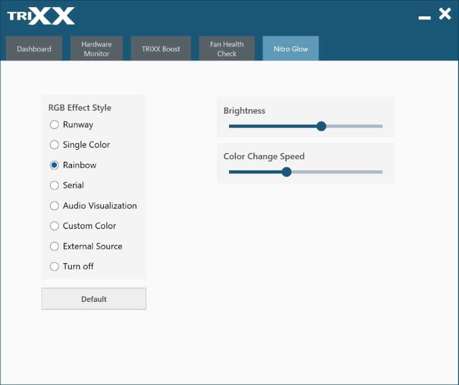 Использование последнего режима Sapphire TRIXX позволяет управлять подсветкой графического адаптера. Последняя версия утилиты позволяет вдоволь поэкспериментировать с этим, выставив опции свечения, синхронизации, многоцветия, звукового сопровождения и пр. Есть ползунки изменения яркости подсветки и скорости мигания.