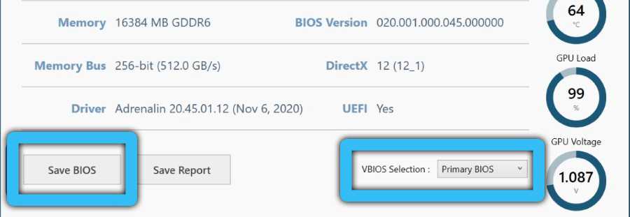 Внизу страницы имеется кнопка Save BIOS, нажав на которую, вы сможете создать резервную копию BIOS. Здесь же можно переключить режим использования БИОС (производительный/экономный). Без утилиты для этого нужно было бы использовать тумблер, расположенный на адаптере.