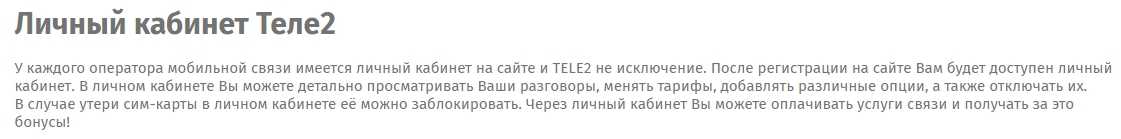 Абонентам Теле2 предоставлена возможность использования личного кабинета на сайте оператора. Чтобы иметь выбор способов управления своим счётом и услугами, а также связи с технической поддержкой, каждому клиенту желательно зарегистрировать ЛК. Функционал личного кабинета позволяет в реальном времени отслеживать свой баланс, просматривать выписки, управлять услугами, опциями, тарифами и так далее.