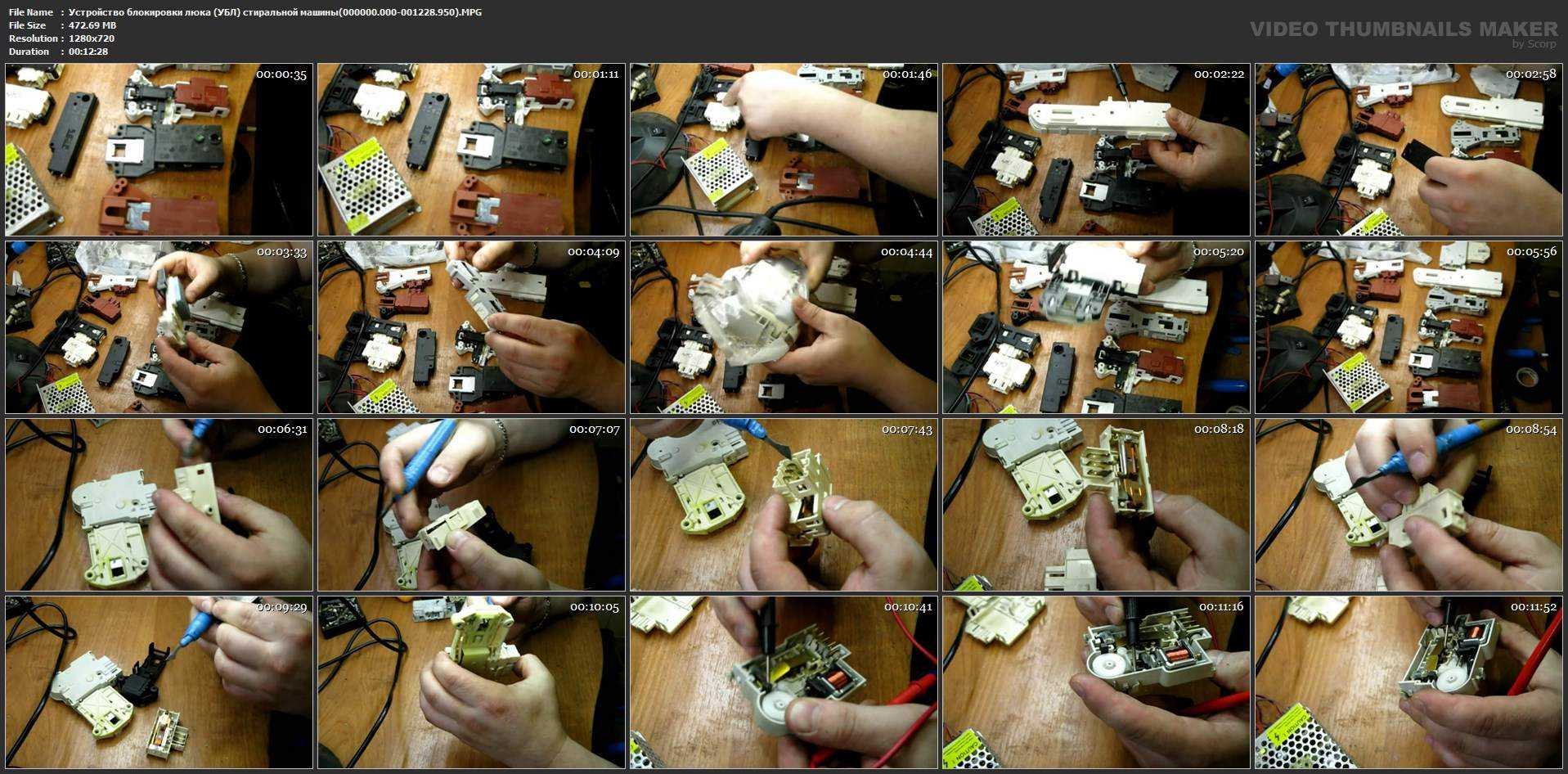- Проверить правильность работы УБЛ — устройства блокировки люка, возможно, при отсутствии механических поломок, причина в неисправности электроники: осмотреть проводку УБЛ, произвести ремонт или замену УБЛ.
