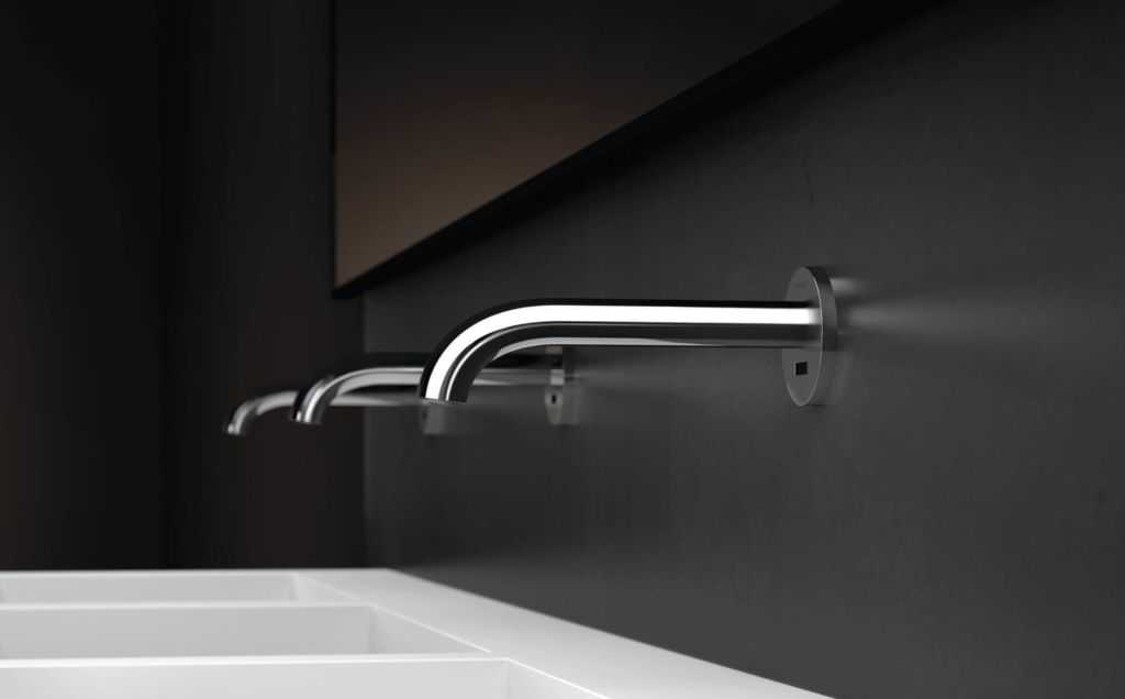 Модель представляет собой смеситель с коротким изливом, который выполнен из хромированной латуни и оснащен сенсорным механизмом включения. Возможна ручная настройка температуры, давления и чувствительности. Работает от электрической сети или пальчиковых батареек.