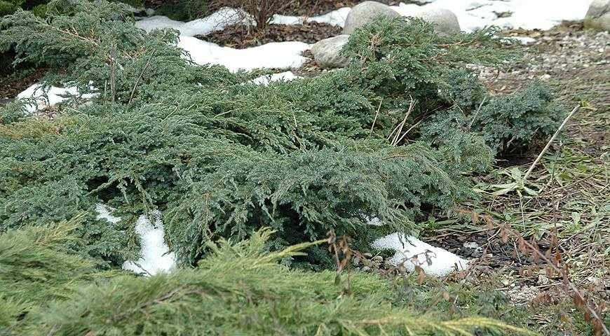 Практически все виды можжевельника морозостойки, поэтому специальное укрытие от холода на период зимовки им не нужен, кроме самой первой зимы после высадки, когда саженец еще не достаточно окреп. Для молодых растений в качестве укрытия используют лапник или любой нетканый материал. В конце зимы и ранней весной можжевельник следует защищать от ярких солнечных лучей, иначе хвоя на побегах буреет.