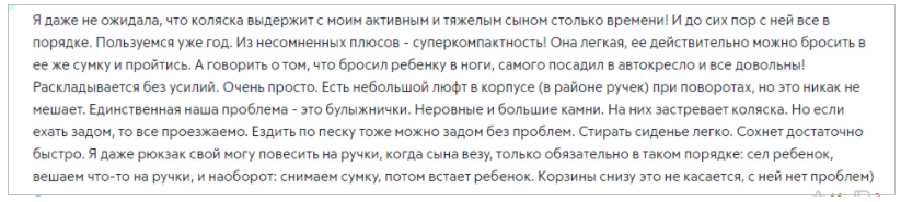 - продуманная комплектация (большой откидной капюшон, варежки и накидка на ножки, смотровое окошко над местом крепления сумки, варежки для мамы);