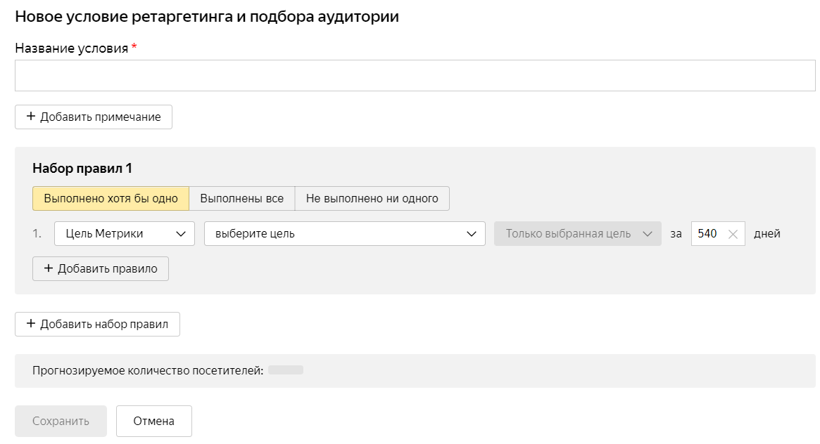Ретаргетинговое условие добавляется через оператор «И» — в этом важное отличие от ретаргетинга в РСЯ, где работает оператор «ИЛИ». Настройка доступна на уровне группы объявлений