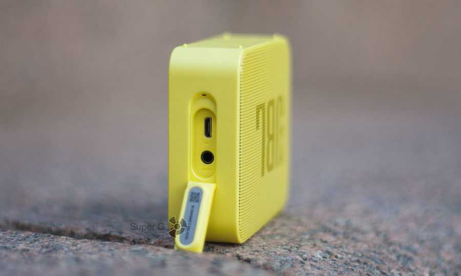 На правой стороне JBL Go можно видеть разъемы для зарядки micro-USB и подключения аудиокабеля, а также микрофон. Фронтальная часть покрыта металлической решеткой, защищающей динамик и маленький LED-индикатор.