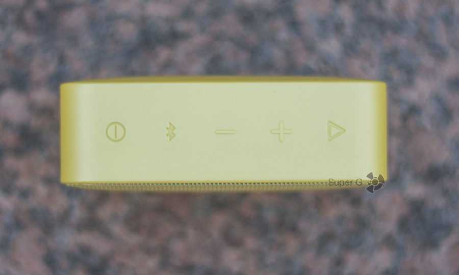А на верхней грани у JBL GO 2 располагается целых пять кнопок управления: для включения колонки, активации Bluetooth, две для регулировки громкости и последняя – pause / play для музыки. То есть почти всем управлять можно непосредственно с динамика, по двойному нажатию на плэй можно переключать треки вперёд. Возврат к предыдущей мелодии не работает.