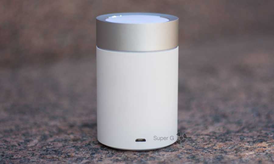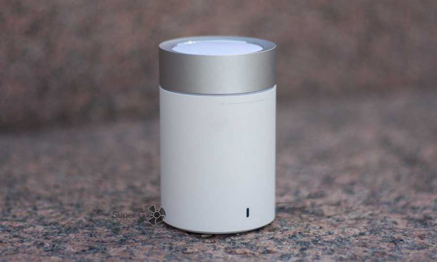 Динамик расположен сверху, он же играет роль кнопки для включения (да, прямо полностью нажимается). Алюминиевый ободок вращается вокруг своей оси, регулируя громкость колонки. И больше никаких элементов управления нет. Да и вообще на корпусе больше ничего нет: только светодиод спереди и Micro USB-порт для зарядки сзади.