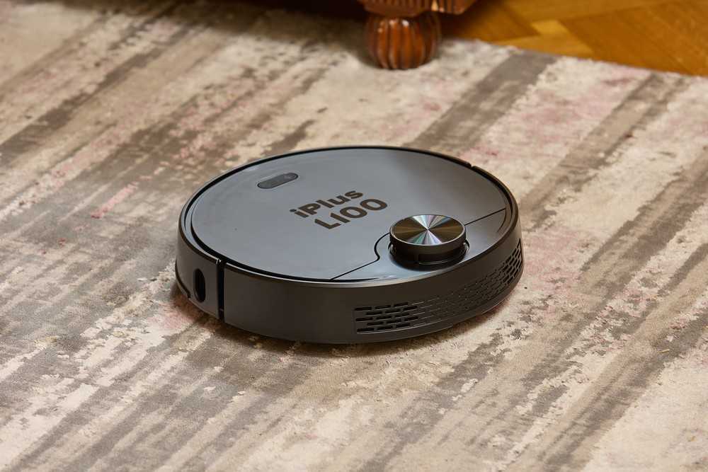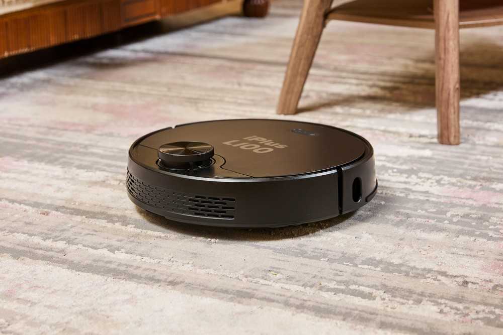 Электронный помощник iPlus L100 обладает размерами 346*340*99 мм, изготовлен из качественного пластика черного цвета и имеет традиционную для таких устройств круглую форму. На верхней панели гаджета расположены кнопка питания и перезарядки, индикатор Wi-Fi, а также башня лидара. Под верхней крышкой располагается контейнер для сбора мусора на 450 мл с устройством для очистки резервуара и турбощетки. Чтобы мусор было удобно извлекать, крышка контейнера открывается. Сзади установлены HEPA и первичный фильтр для очистки воздуха. На боковых сторонах имеется амортизирующий бампер с вмонтированными датчиками распознавания препятствий, а также ИК и лазерный датчик.