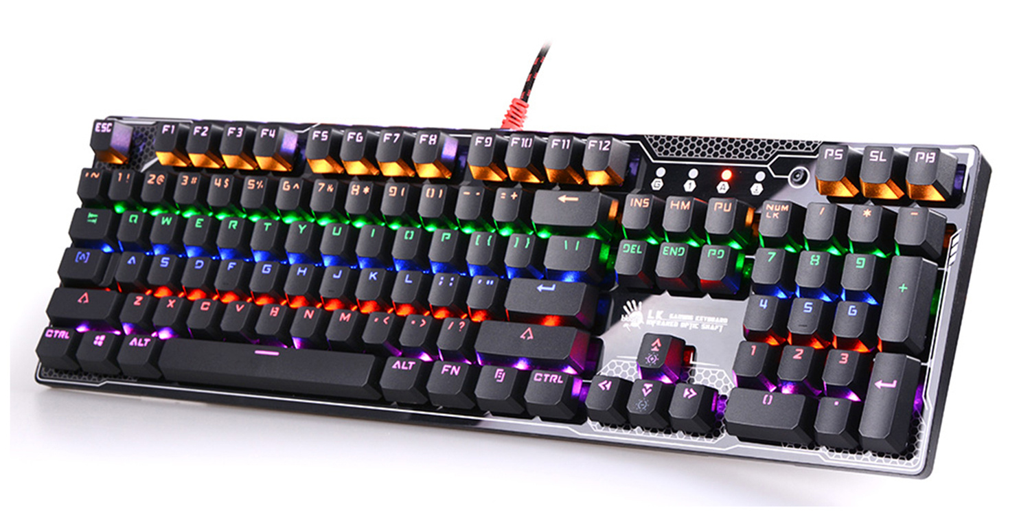 Отличным бюджетным вариантом станет данный кейборд от Bloody B810R. Модель создана для любителей броских, нетипичных дизайнов. Корпус клавы украшен узором, напоминающим соты. А для гравировки букв используется характерный заостренный шрифт. Сама клавиатура является полноформатной и в ширину превышает 40 см.